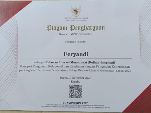 | Pekanbaru | Jumat 14/11/2025, 12:05 WIB Feryandi, Relima Bangka Tengah, Sabet Penghargaan Nasional dari Perpusnas