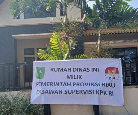 | Spanduk bewarna putih itu bertuliskan "Rumah dinas ini milik Pemerintah Provinsi Riau Dibawah Supervisi KPK," |